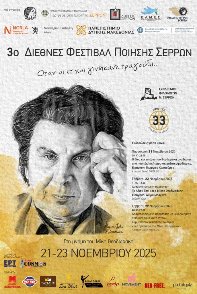 Ο Σύνδεσμος Φιλολόγων Νομού Σερρών, πιστός στο ραντεβού του με την ποίηση, διοργανώνει το 3ο Διεθνές Φεστιβάλ Ποίησης Σερρών στις 21-23 Νοεμβρίου. Προσκεκλημένοι είναι 33 ποιητές και ποιήτριες από όλον τον κόσμο, ενώ το Φεστιβάλ είναι αφιερωμένο στη μελοποιημένη ποίηση του Μίκη Θεοδωράκη και έχει τίτλο «Όταν οι στίχοι γινήκανε τραγούδι».