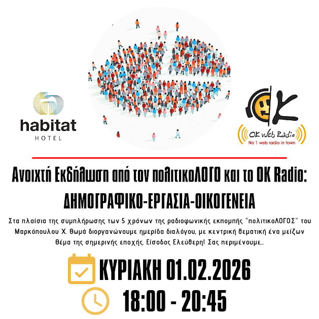 Σε μια εποχή όπου το δημογραφικό πρόβλημα, οι συνθήκες εργασίας και ο ρόλος της οικογένειας διαμορφώνουν καθοριστικά το μέλλον της χώρας, ο πολιτικοΛΟΓΟΣ και το OK Radio διοργανώνουν μια ανοιχτή εκδήλωση διαλόγου και προβληματισμού, την Κυριακή 1 Φεβρουαρίου 2026, από τις 18:00 έως τις 20:45, στον φιλόξενο χώρο του Habitat Hotel στο Κιλκίς.