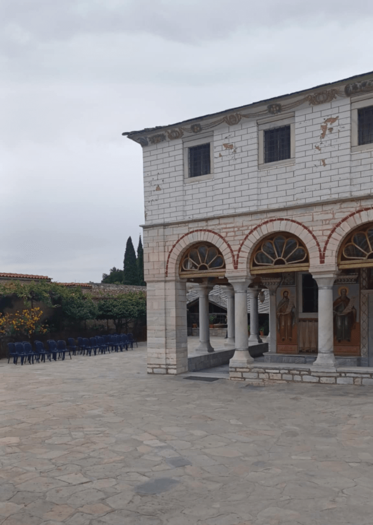 Μόλις περάσαμε την πύλη της Μονής, βρεθήκαμε στο όμορφο προαύλιο, όπου μαρμάρινοι και πέτρινοι περίβολοι φιλοξενούσαν ολάνθιστες γλάστρες και παρτέρια γεμάτα χρώματα και αρώματα. Κατευθυνθήκαμε προς το κέντρο του προαυλίου, όπου δεσπόζει ο Ναός των Εισοδίων της Θεοτόκου.