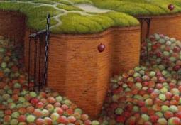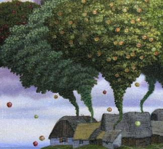 Τα μήλα εμφανίζονται παντού -στα δέντρα, στο έδαφος, ακόμη και αιωρούμενα στον αέρα- δημιουργώντας μια ευχάριστη αίσθηση αφθονίας. Παρότι, όμως, το σύνολο της εικόνας αποπνέει ασφάλεια, αρμονία και ευημερία, ο ουρανός στο φόντο σκοτεινιάζει σταδιακά και βαραίνει, εισάγοντας μια υποβόσκουσα ένταση και την αίσθηση μιας επερχόμενης καταιγίδας.
