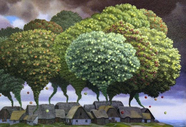 Τα σπίτια εδώ δεν είναι απλώς κατοικίες· μοιάζουν με μικρά κύτταρα ενός ζωντανού οργανισμού. Από τις στέγες τους αναδύονται μηλιές, σαν προεκτάσεις της ίδιας της ζωής των κατοίκων, λες και κάθε σπίτι καλλιεργεί κάτι δικό του – σκέψεις, επιθυμίες, μνήμες. Τα δέντρα απλώνονται σαν μικρά “συννεφάκια σκέψης”, υποδηλώνοντας πως μέσα σε κάθε οικία κυοφορείται κάτι που ωριμάζει και κάποτε θα καρποφορήσει.